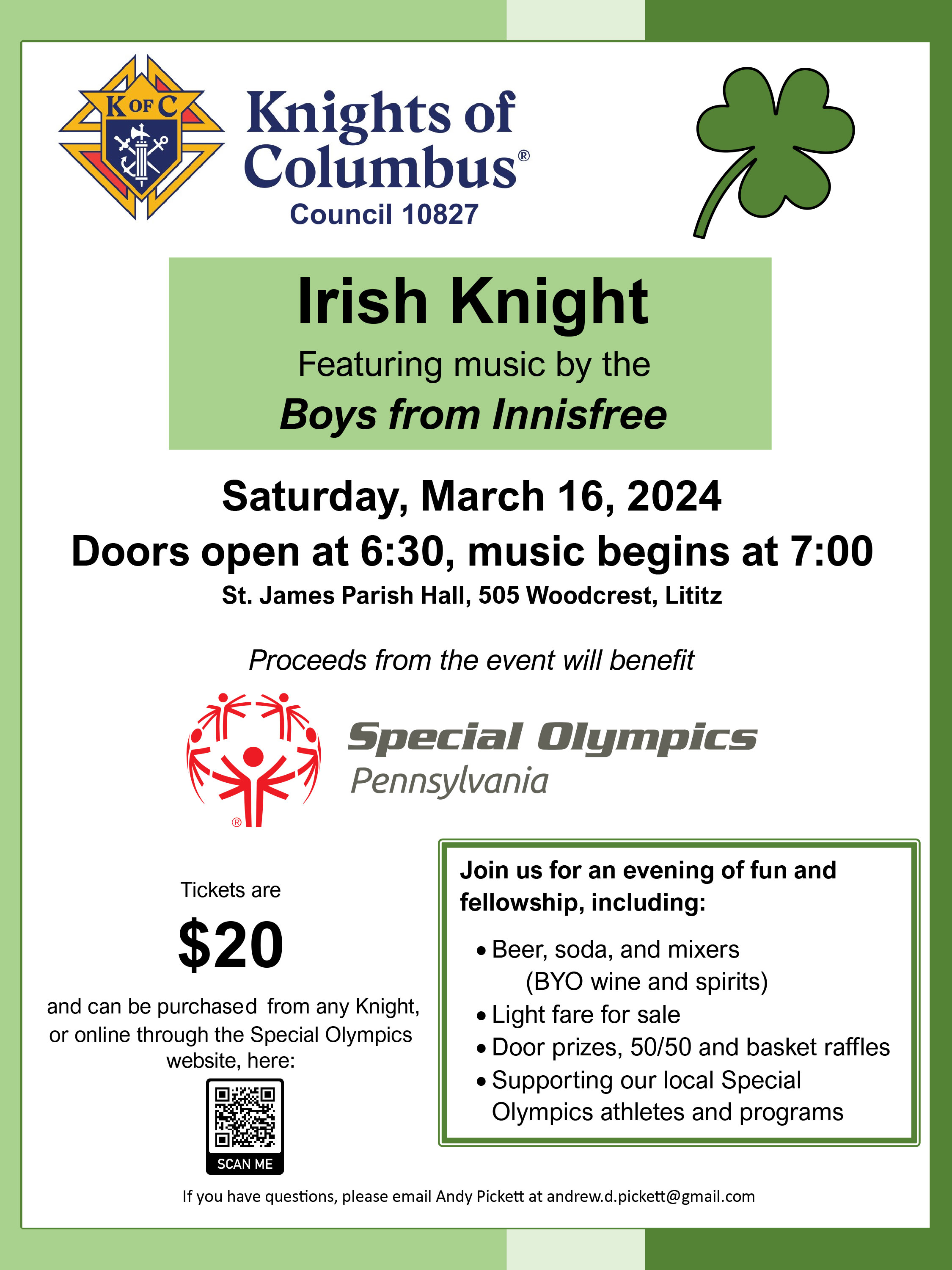 Tickets are $20 each and include admission to the party, free beer, and set-ups. The Knights of Columbus will have food for sale, but you may bring your own food, snacks, and beverages of all types (BYOB)!  There also will be door prizes, 50/50s, and basket raffles.